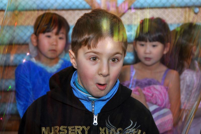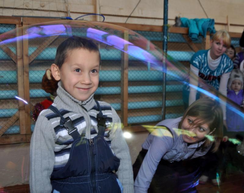 После основной концертной программы детей ждал еще один сюрприз – шоу мыльных пузырей. Дети визжали от восторга, так им понравились гигантские радужные пузыри, которые даже можно было примерить на себя. На этом представлении дети светились от радости, а взрослые думали о том, какое счастье подарить детям из Охотска Рождество!