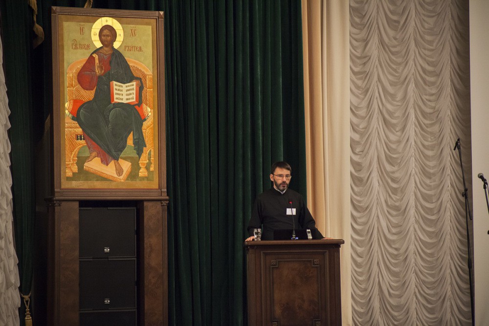 На открытии форума секретарь Ученого совета МДА, доцент игумен Адриан (Пашин) зачитал приветственное слово председателя Учебного комитета Русской Православной Церкви, ректора МДА архиепископа Верейского Евгения.