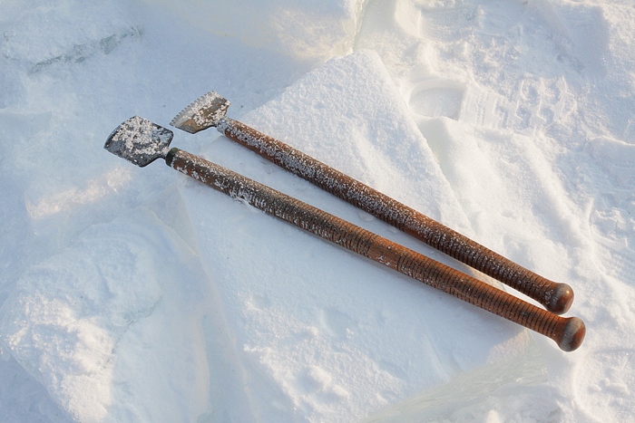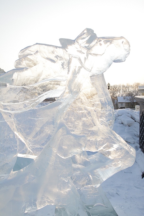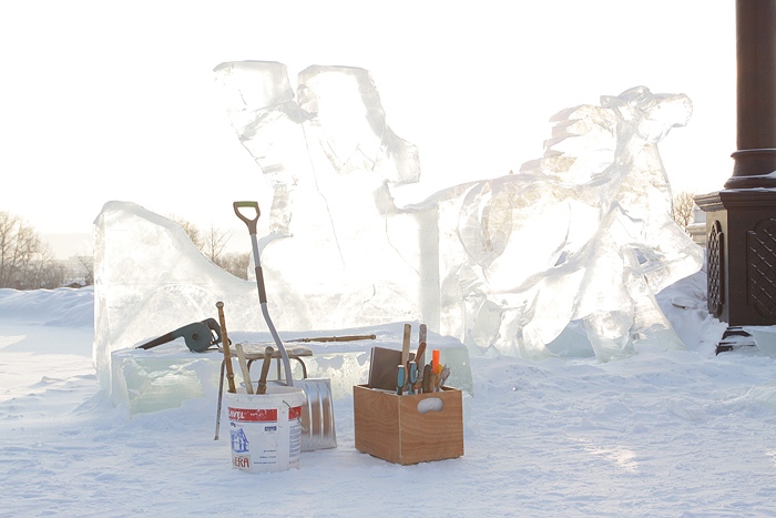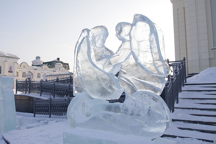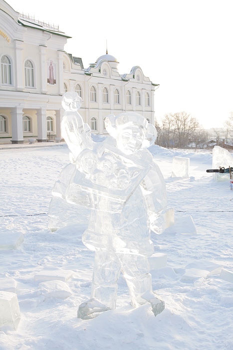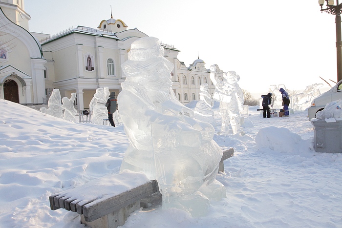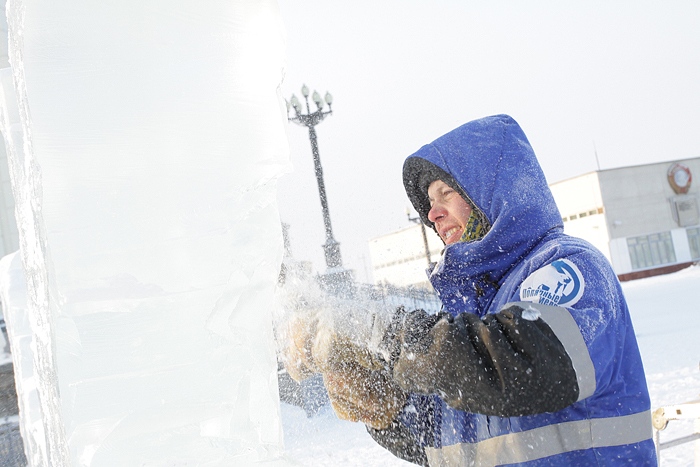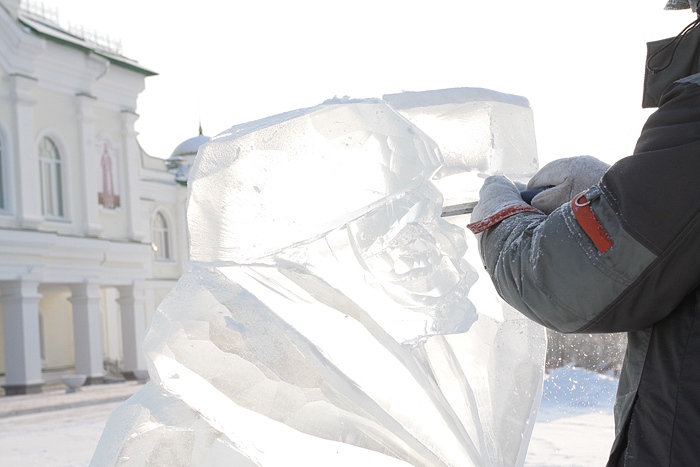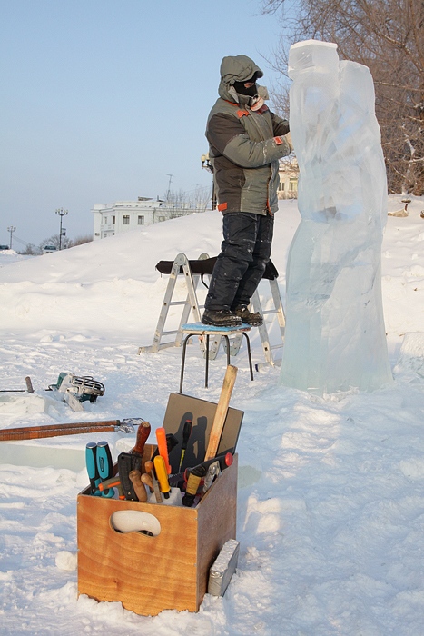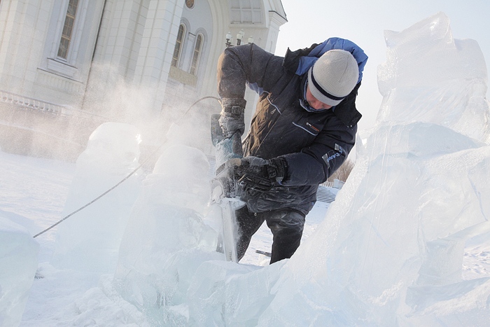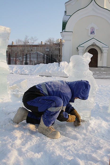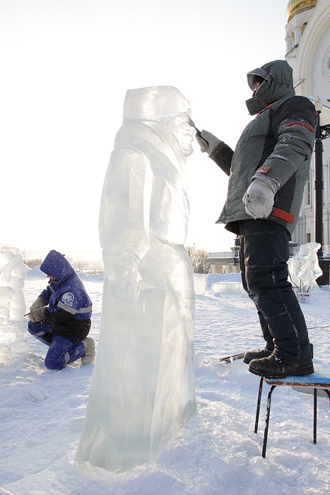 Создание ледовых скульптур возле Спасо-Преображенского кафедрального собора Хабаровска. 31 декабря 2012 г.
